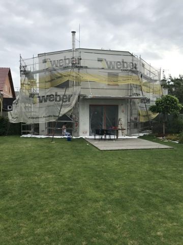 Nátěr jsme provedli bílou fasádní barvou Baumit StarColor, kterou požadovala stavební firma. My ji také často používáme a máme s ní velmi dobré zkušenosti. Jde o kvalitní vodě i nečistotám odolný nátěr s vysokým krytím.